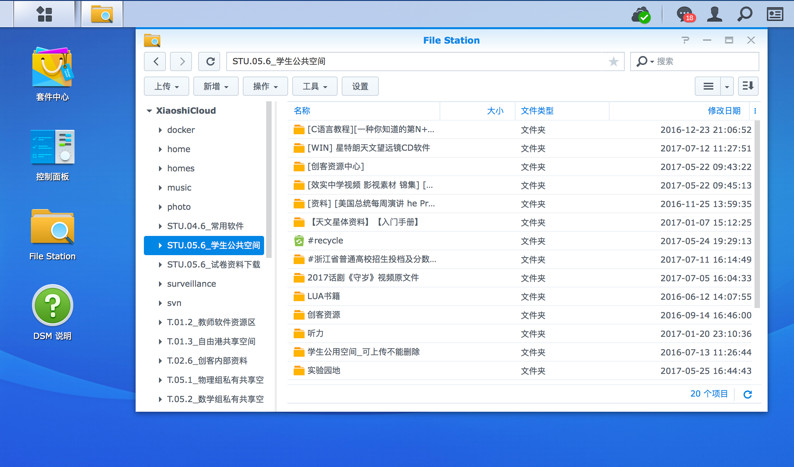 說(shuō)到資料的整合,這里也不得不說(shuō)一下資料的存儲(chǔ)與管理。學(xué)校因?yàn)轭?lèi)別繁復(fù),文件較多且較分散,存放及調(diào)取都非常麻煩。使用 File Station 之后可以非常便利的進(jìn)行分類(lèi)并存放文件,全校都可以用來(lái)存儲(chǔ)下載文件。通過(guò)不同的權(quán)限分配,以及不同功能的文件夾,將不同課目,不同班級(jí)等進(jìn)行整理分類(lèi)后, 所有文件一目了然。