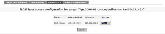在系統(tǒng)菜單“System”菜單下的“Network Access Configuration”區(qū)域,配置允許訪問 Openfiler 系統(tǒng)的安全訪問控制列表。值得注意的是只有加入到 Openfiler 的網(wǎng)絡(luò)訪問控制列表中的網(wǎng)絡(luò)或者主機(jī)地址,才允許訪問 Openfiler 系統(tǒng)所提供的虛擬存儲(chǔ)服務(wù)。在網(wǎng)絡(luò)訪問控制列表中,既可以配置網(wǎng)段地址也可以配置單個(gè)主機(jī)地址。在本例填入 192.168.130.0 網(wǎng)段,設(shè)置類型為“Share”方式,添加完成后點(diǎn)擊“Update”完成系統(tǒng)配置更新。如圖