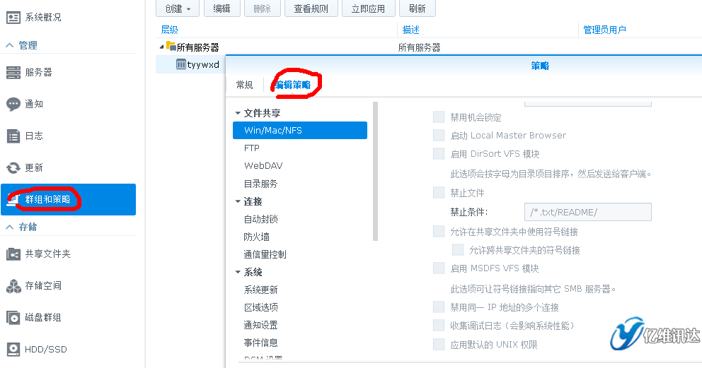 群暉Synology 山西總代:太原億維訊達科技 策略是一系列規(guī)則,其中每個規(guī)則都是指定的設置首選項,如啟用 Windows 文件服務或啟用 SSH 服務。當一項策略被應用到托管服務器或服務器組后,被該策略規(guī)則定義的首選項將應用到該服務器或服務器組。這可讓您將統(tǒng)一的設置應用多臺服務器而無需分別登錄每臺服務器。